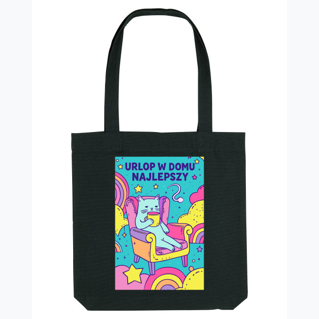 Ta torba bawełniana z nadrukiem kota i hasłem „Urlop w domu najlepszy” to idealna towarzyszka: